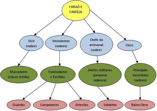 Na pirâmide que apresenta a hierarquização da sociedade egípcia antiga, o topo é ocupado pela família do faraó, pois como ele era considerado um deus encarnado era privilegiado com regalias excepcionais.
