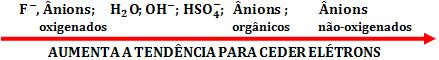 Quanto mais o ânion for eletronegativo, mais difícil será para descarregá-lo. Deste modo, os ânions oxigenados e o F– apresentam grande dificuldade em ceder elétrons.