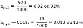 Se colocarmos 1 mol de HCl em 1 litro de água, podemos verificar que, para cada 1 000 moléculas de HCl dissolvidas, 920 sofrem ionização e 80 não ionizam.