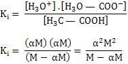 Sendo α o grau de ionização do ácido, ocorrerá ionização de α M mols/litro do ácido, com formação de α M mols/litro de H3O+ e α M mols/litro de .
