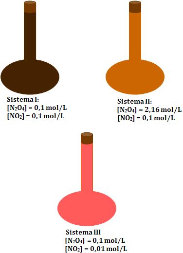 Considere três sistemas contidos de uma mistura dos gases N2O4 (incolor) e NO2 (vermelho) com as concentrações assinaladas.