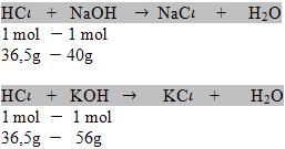 36,5g de HCl (1eq. g) reagem com 40g de NaOH (1 eq.g)