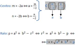 Considerando a equação x2 + y2 + m . x + n . y + p = 0 na forma geral, o centro e o raio serão determinados comparando-se com a equação