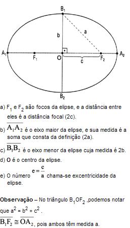É o lugar geométrico dos pontos de um plano tal que a soma de suas distâncias a dois pontos fixos, denominados focos, F1 e F2, é constante, igual a 2a e maior que a distância entre os focos (2a > 2c)