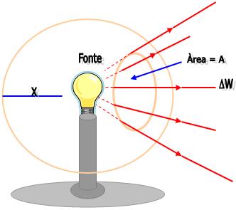 Suponhamos que uma fonte pontual de ondas esféricas, como por exemplo, uma pequena lâmpada é posta no centro de uma superfície esférica que possui um raio igual a x, onde tem uma abertura com uma área igual a A, como nos mostra a figura abaixo: