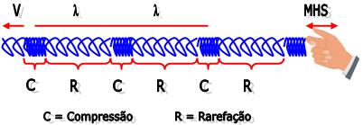 Vamos supor que uma pessoa, segure em uma das extremidades de uma mola flexível e longa, provocando assim nesta extremidade um movimento harmônico simples (M.H.S), com um período T e freqüência f = 1/T, na direção do eixo longitudinal da mola, como podemos observar na figura abaixo: