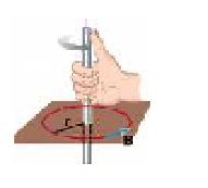 *Considerando que um fio fure um papel em um ponto denominado F, onde ele está perpendicular ao papel. Como vimos anteriormente, a corrente elétrica é ascendente, portanto dizemos que o campo está no sentido anti- horário, como vemos na ilustração abaixo: