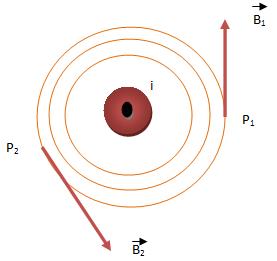 2- Vamos imaginar uma folha onde sobre ela há um fio retilíneo na horizontal. Esse fio irá representar as linhas de indução e os vetores que entram e saem deles, onde à esquerda do fio B irá apontar para cima, e o campo magnético irá sair da folha, e a direita do fio, B irá apontar para baixo e o campo irá penetrar na folha.