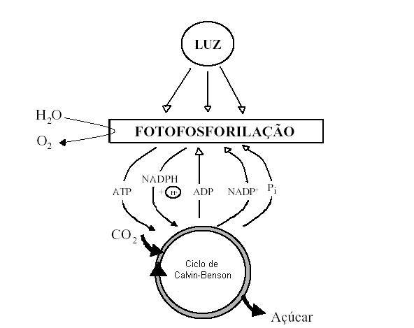 Conforme visto até agora, a fotossíntese pode ser descrita como um processo no qual a energia luminosa absorvida pela clorofila origina o transporte de elétrons (conversão da energia luminosa em energia elétrica), que por sua vez gera energia química, esta acumulada nas moléculas de ATP e NADPH. Estas moléculas são utilizadas nas etapas seguintes da fotossíntese, representadas pela assimilação do carbono ("reações do escuro" ou "fase escura"), ligando o CO2 em um aceptor, reduzindo-o assim a CH2O (carboidrato). Na figura abaixo, é mostrada a "conexão" entre a fase luminosa e a fase escura da fotossíntese.