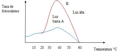 Observe que como a intensidade luminosa baixa, a temperatura não tem quase efeito, neste caso a luz é o fator limitante. Porém, quando a intensidade luminosa é alta, a temperatura influi fortemente no processo da fotossíntese.