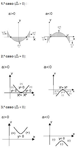 O estudo do sinal da função do 2.º grau é feito determinando-se os seus zeros (caso existam) e analisando o esboço do gráfico.