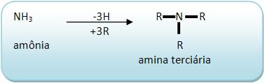As aminas terciárias derivam do NH3 através da substituição dos 3H por três radicais derivados de hidrocarbonetos.