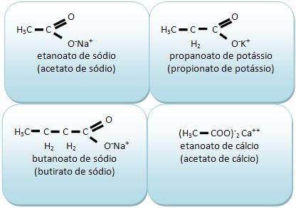 O nome dos sais orgânicos segue a mesma regra dos outros funções, porém usam-se o sufixo ato seguindo da partícula de e do nome do metal. Entre parênteses está o nome usual do sal.