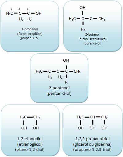 Caso a cadeia do álcool apresente 3 ou mais átomos de carbono, deve-se indicar a posição do grupo –OH numerando assim a cadeia carbônica começando pela extremidade mais próxima do grupo –OH.