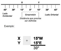30° é a distância entre X e Y. Essa distância deverá ser convertida para horas: 30° = 2 horas.