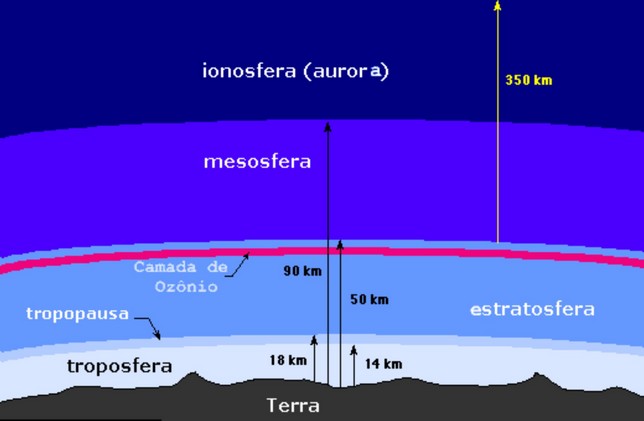 A ionosfera é uma camada que possui grande quantidade de partículas de eletricidade chamada de íons. Essa camada atinge até 640 km acima da superfície da Terra e reflete ondas de rádio, com 30 MHz, em média.