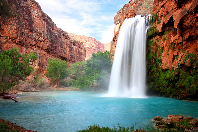 Com a água de cor azul-turquesa, está localizada na Reserva Havasupai, na região do Grand Canyon, no Arizona. Para chegar até ela, você precisa caminhar aproximadamente 16 quilômetros ou então, se preferir, realizar uma pequena viagem de helicóptero. Além de aproveitar um relaxante banho fresquinho em uma temperatura de 21 °C, você também pode fazer um piquenique no lado oposto do riacho e, claro, observar a mais fascinante paisagem dessa belíssima cachoeira.