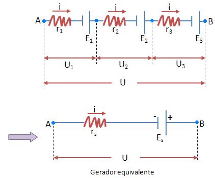 b) a f.e.m da associação é a soma das f.e.m dos geradores em série: ES = E1 + E2 + E3.