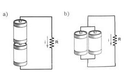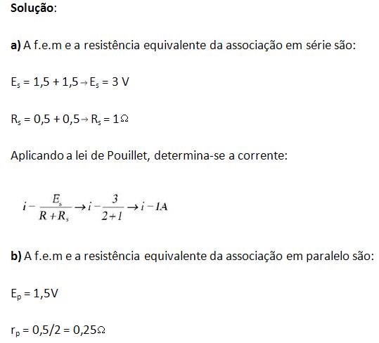 Duas pilhas iguais, cada uma com f.e.m E = 1,5 V e resistência interna r = 0,5 , são associadas. A associação é ligada a um resistor de 2 , conforme as figuras. Determine a intensidade da corrente no resistor em cada uma das associações.