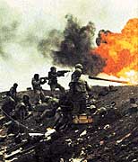 | Desse modo, o que favoreceu o Iraque, foi o país poder contar com o apoio das maiores potencias como EUA, URSS. Isso garantiu ao Iraque uma condição de continuar lutando contra o Irã. Apesar disso, em meados dos anos 80, o Iraque perdeu o apoio destes países, pois foi acusado de ter utilizado armas químicas contra o Irã. | ![]() |