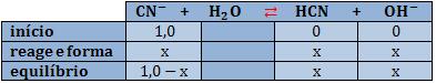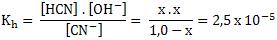 Vamos calcular a constante de hidrólise, o grau de hidrólise e o pH de uma solução 1,0M de NaCN, tendo conhecimento de que a constante de ionização do ácido cianídrico é 4 x 10-10, a 25°C.