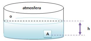 Usando o ponto A como referência, para descobrirmos a pressão total do líquido, devemos simplesmente aplicar a Lei de Stevin, entre o ponto A e O, que se localiza na superfície do líquido. Com isso usamos: