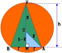 Ao dividir os sólidos em partes e colocá-lo em um plano, o mesmo possuirá um triângulo com dois lados iguais VAB de base 2r e altura h no raio R. Assim,