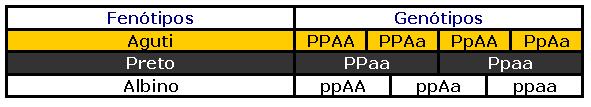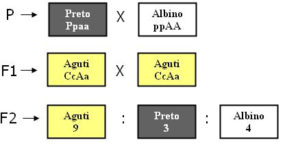 No cruzamento entre um rato preto (Ppaa) e um rato albino (ppAA), em F1 vão aparecer somente ratos agutis, pelo fato dos genes P e A se interagirem, já no cruzamento entre os dois ratos da F1, vão ser gerados na F2 agutis, pretos e albinos, na proporção 9:3:4.