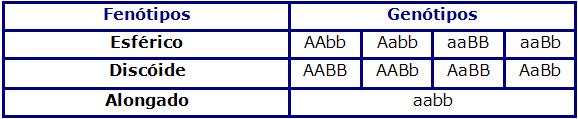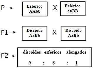 No cruzamento entre frutos esféricos que possuem genótipos AAbb e frutos esféricos com genótipos aaBB, a F1 é totalmente de frutos diplóides, e em F2 vão aparecer frutos discóides, esféricos e alongados, na proporção 9:6:1.