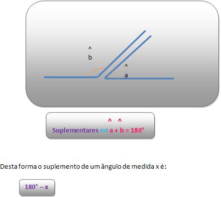 Ângulos suplementares Por Redação31/05/2012 às 17:48 Ângulos suplementares Podemos considerar dois ângulos como sendo suplementares, quando a soma de suas medidas resultarem em dois ângulos retos, onde um é suplemento do outro.