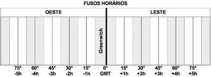 No Planeta Terra, temos 24 horas ou 24 fusos horários distribuídos pelos dois hemisférios (Oeste e Leste). Por convenção, o início da contagem das horas faz-se no meridiano de Greenwich (GMT).