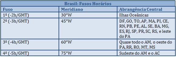 Pela posição geográfica do Brasil, totalmente na parte ocidental do Planeta, e por sua grande dimensão no sentido Oeste-Leste, nosso País apresenta 4 fusos horários, estando todos atrasados em relação ao meridiano de Greenwich.