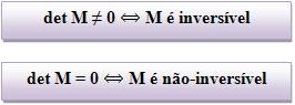 Quando det M = 0 a matriz M não admitirá a inversa, sendo assim a matriz M será denominada não-inversível.