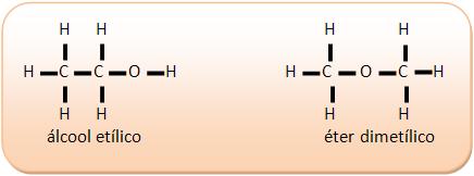 As duas substâncias apresentam os mesmos átomos, porém ligados de modo diferentes. Por esse motivo, os isômeros são compostos que apresentam propriedades diferentes. O etanol é um líquido que designa uma ponte de hidrogênio intermolecular e possui ponto de ebulição igual a 78°C. Já o éter dimetílico é um gás nas condições ambientais, que apresenta ponto de ebulição muito baixo (- 24°C), pois não constitui ponte de hidrogênio.
