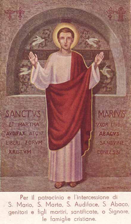 A história do chamado São Mário começo começou a ser difundida a partir da metade do terceiro século depois de cristo, quando os martírios de Mário, Marta, Audifax, Ábaco e do sacerdote Valentim passaram a se tornar conhecidos em diversos locais, com suas histórias espalhada especialmente dentro da comunidade católica.