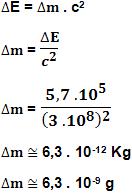A partir dessa equação conclui-se que: a liberação das 136 000cal resultará na perda de 6,3 . 10-9 g.
