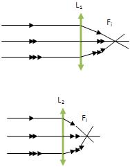Observando os esquemas acima, podemos perceber que a lente L2 é mais convergente que a lente L1. Isso se explica pelo fato da lente L2 ter uma menor distância focal, convergindo mais repentinamente os raios de luz.