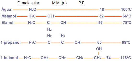 Pelo fato de que as pontes de hidrogênio da água ser mais resistente o ponto de ebulição é maior, percebemos então que o ponto de ebulição dos álcoois apresentando até 3C são menores, do que o ponto de ebulição da água.