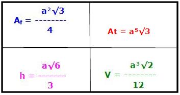 Resumo Por Redação31/05/2012 às 17:49 Resumo Se considerarmos que VABC é um tetraedro regular de aresta a, então a área de uma face, a área total, a altura e o volume e valem: