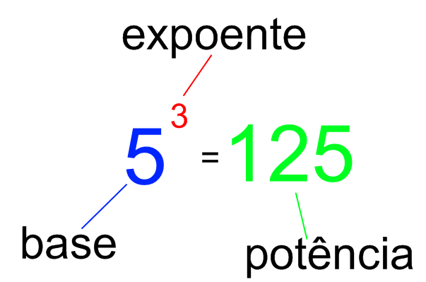 Na potenciação, usamos as nomenclaturas: base, para o número a ser multiplicado, e expoente, para o número de vezes que esse número irá se multiplicar, e potência, para o resultado.