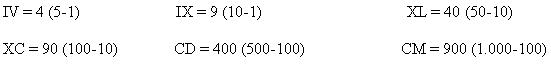 Os numerais I, X e C, escritos à esquerda de numerais maiores, subtraem-se seus valores aos desses numerais.