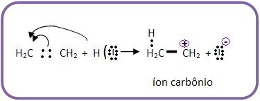 a) Heterólise do HI e ataque do H+ (eletrófilo) ao composto orgânico. O cátion de carga positiva em átomo de carbono é denominado como genérico de íon carbônio.