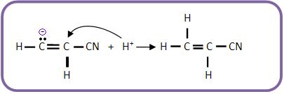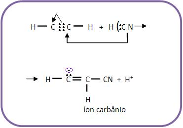 a) Heterólise do HCN e ataque o CN- (nucleófilo) ao composto orgânico. O ânion de carga negativa em átomo de carbono é denominado como genérico de íon carbânio.