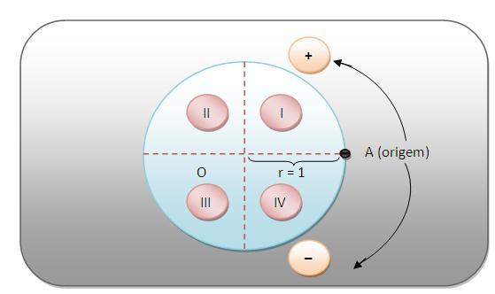 Este ciclo é considerado uma circunferência com único raio, que fica fixado em um ponto (A), como sendo a origem do arco, adotando um sentido anti-horário positivo.