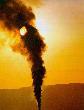 | A poluição atmosférica caracteriza-se basicamente pela presença de gases tóxicos e partículas sólidas no ar. As principais causas desse fenômeno são a eliminação de resíduos por certos tipos de indústrias (siderúrgicas, petroquímicas, de cimento, etc.) e a queima de carvão e petróleo em usinas, automóveis e sistemas de aquecimento doméstico.