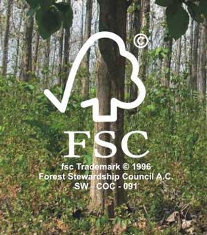 O Conselho de Manejo Florestal (FSC), uma ONG ambientalista internacional, representa o selo verde que apóia os produtos de origem florestal de maneira sustentável.