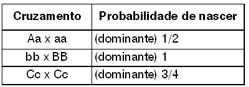Exemplo: Dado o cruzamento AabbCc x aaBBCc, determine a probabilidade de se obter um indivíduo com o seguinte fenótipo para os três caracteres analisados: dominante, dominante e dominante.