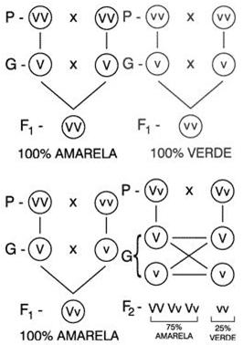 Um par de alelos regula a cor da semente da ervilha: o dominante V produz cor amarela; o recessivo v, cor verde.
