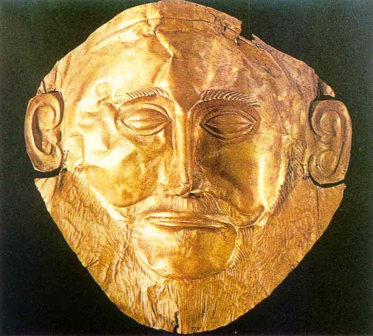 Máscara funerária em ouro, que foi considerada, por muitos anos, como sendo de Agamenon, um dos líderes da expedição micênica contra Tróia. |