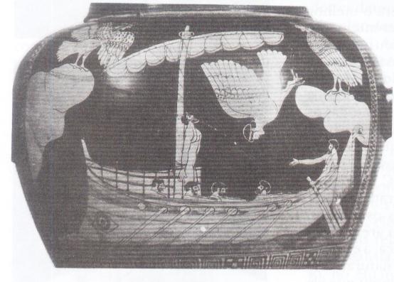 A cerâmica mostra o herói Ulisses sendo atormentado pelas sereias. |